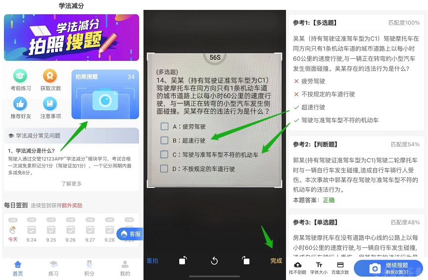 - 驾驶人可以通过考前练习,模拟考试、错题复习、专项练习中进入练习,过程遇到新题或者难以判断和不会的题,都可以使用 学法减分拍照搜题 ,对准不会的题目,点击拍照→点击 完成→系统自动识别出答案,识别出来的答案顺序不一致,需核对正确的答案选择进行答题,切勿跟着顺序选择作答,就能轻轻完成考试,加强记忆;