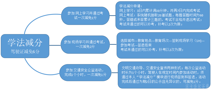 - 学法减分 是指因违法行为被扣分的驾驶人参加学习并通过考试,为加强对机动车驾驶人的交通安全教育,通过互联网平台 交管12123APP 申请学法减分,参加线上:网上学习并考试、参加线下:现场学习并考试、参加交通安全公益活动完成1小时;都可以获得扣减违章违法行为的分数及记录,一个记分周期内减免记分最高可达6分;